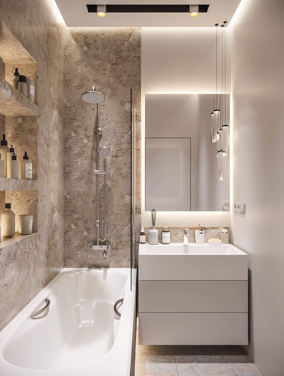 Освещение играет ключевую роль в создании атмосферы ванной комнаты. Современный дизайн предполагает использование нескольких источников света: потолочных ламп, точечного освещения, светодиодных полосок. Это позволит изменять настроение и функциональность пространства в зависимости от вашего настроения.