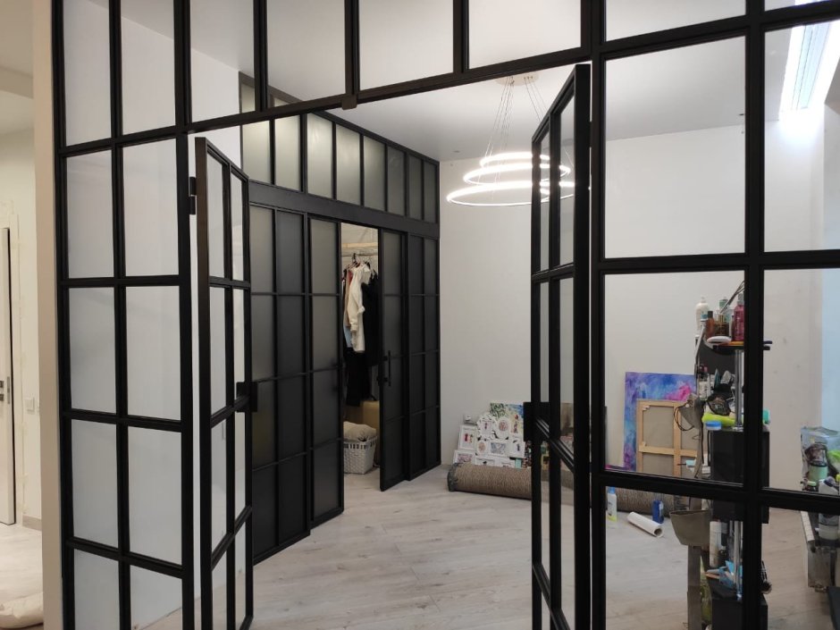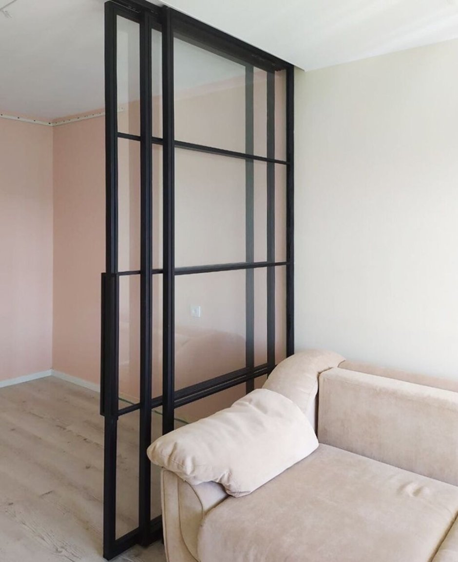 Одним из популярных вариантов лофт-перегородок являются стеклянные раздвижные двери. Они позволяют сохранить открытость пространства и одновременно создать частную зону. Стержни из черного металла придают перегородке промышленный шик.