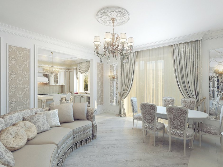 В результате, этот классический интерьер гостиной в светлых тонах является идеальным сочетанием изысканности и функциональности. Он создает гармоничное и приятное пространство для отдыха и развлечений, где каждая деталь пропитана элегантностью и стилем.