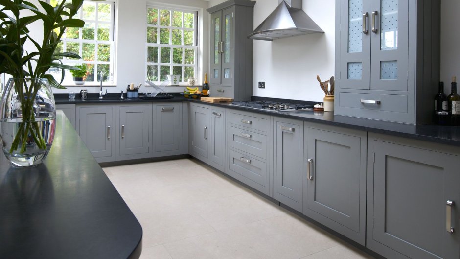 Серая кухня черная столешница