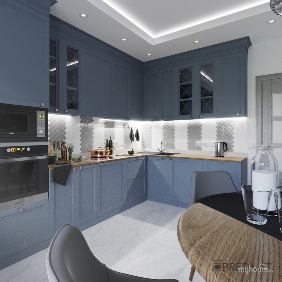 Если вы предпочитаете более классический стиль, то серо-синяя кухня можно сочетать с мраморной или гранитной столешницей, создавая элегантное и роскошное ощущение.