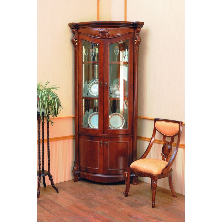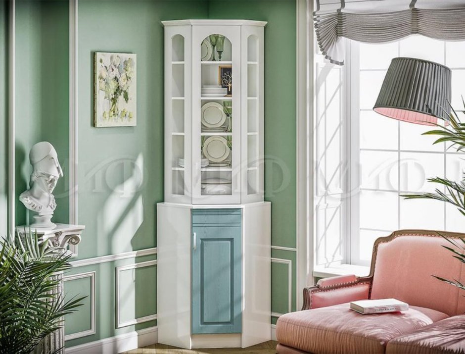Дизайн угловых сервантов может быть разнообразным и оригинальным. Вы можете выбрать модель с закрытыми дверцами или открытыми полками, с зеркальными или стеклянными вставками, с интарсией или резными элементами. Такой мебельный предмет станет не только удобным для хранения, но и ярким акцентом в вашем интерьере.