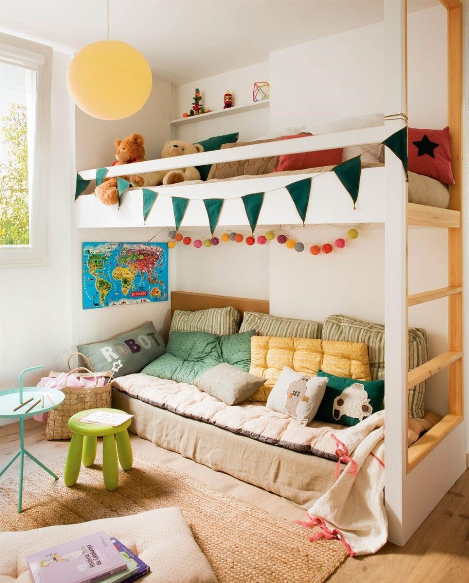 Детская комната с двухъярусной кроватью и диваном