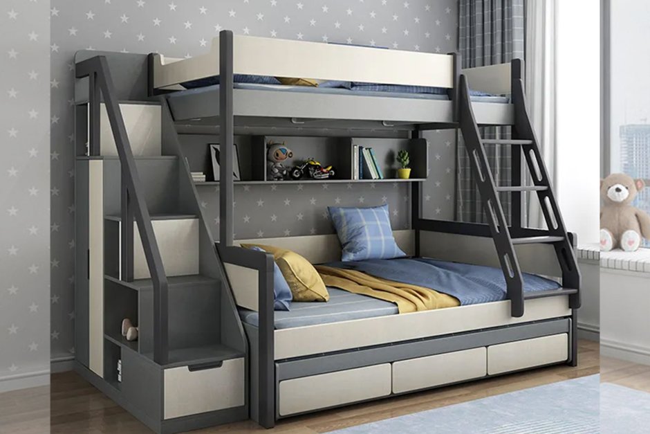 Выбор цветовой гаммы двухъярусной кровати для мальчиков подростков может быть разнообразным. Оттенки синего, серого, зеленого или черного прекрасно гармонируют с мужским стилем и придают спальне элегантность и солидность.