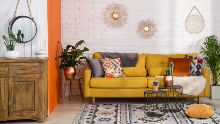 Горчичный диван в интерьере