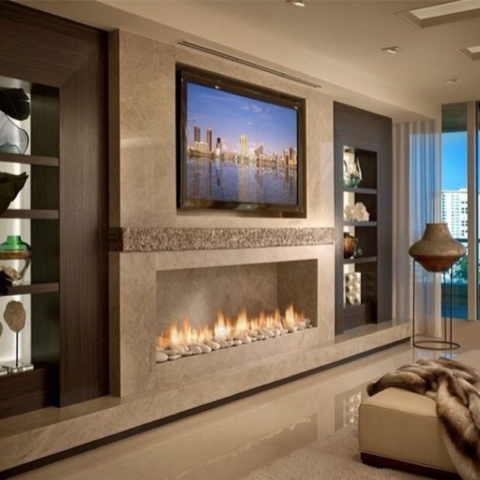 Камин и телевизор в интерьере гостиной