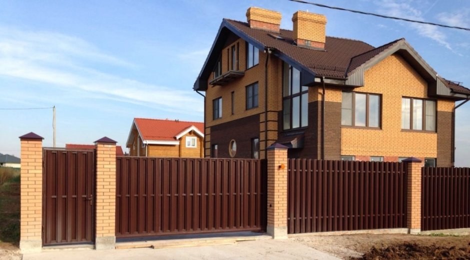 Забор перед домом с кирпичными столбами
