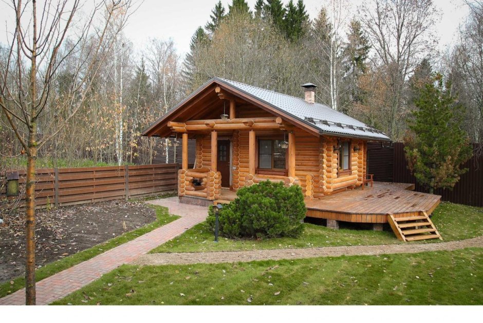 Деревянная баня рядом с деревянным домом