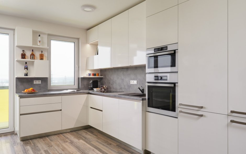 Белая кухня и серая столешка