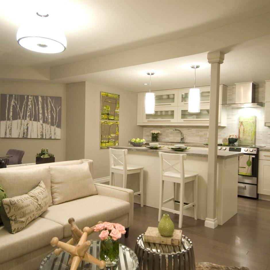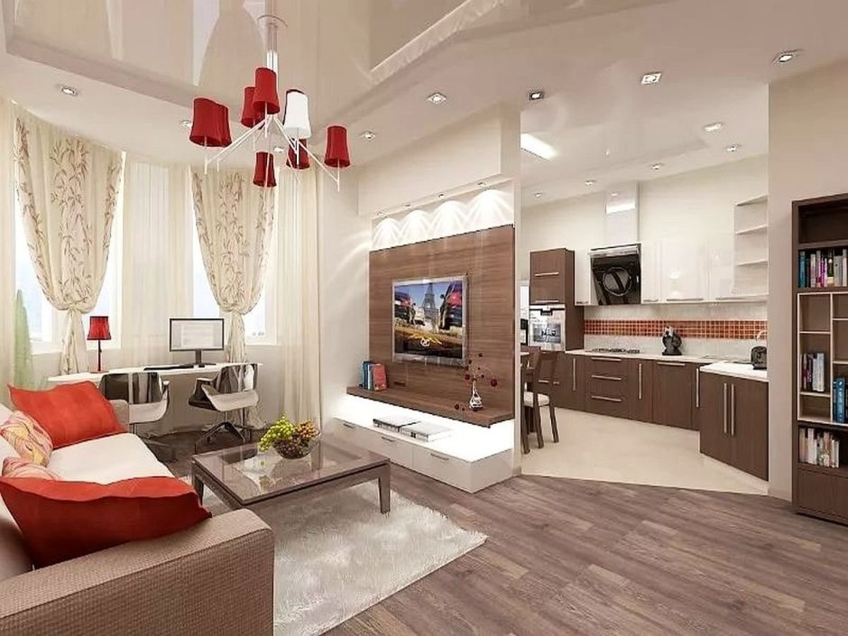 Цветовые решения в этой гостиной-кухне подчеркивают ее характер. Оттенки нейтральных цветов, такие как бежевый или серый, создают спокойную и умиротворяющую атмосферу. Интересные акценты, например, яркие подушки или картины, добавляют яркости и жизнерадостности.