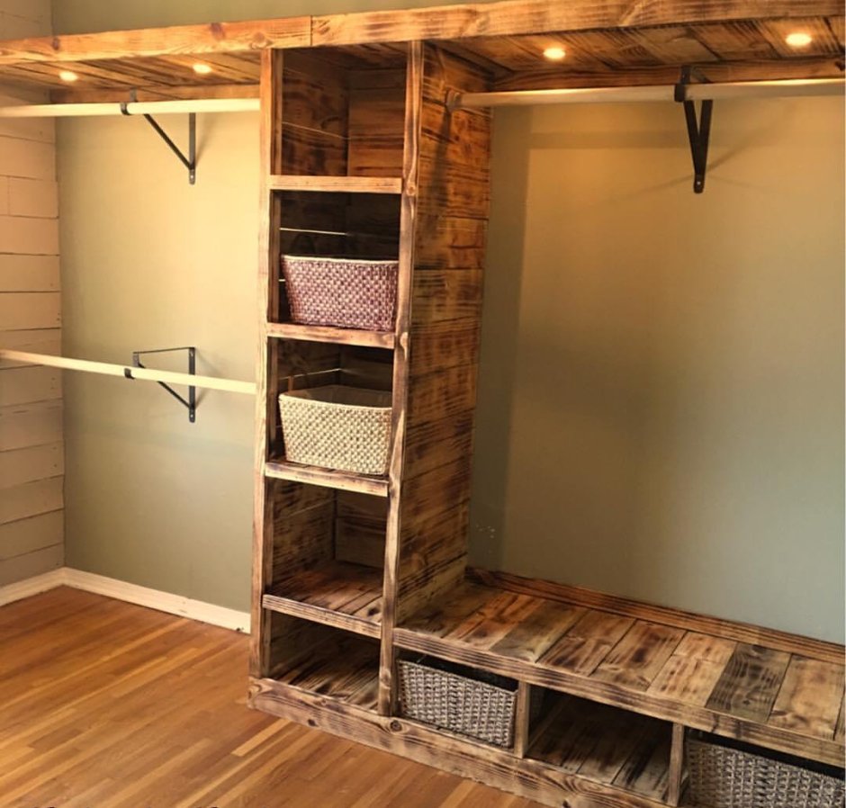 После этого приступайте к изготовлению. Постепенно стройте основу шкафа, прикрепляйте полки и вешалки. Не забудьте о дверях – вы можете выбрать различные варианты, начиная от обычных распашных дверей до раздвижных или даже шторок.
