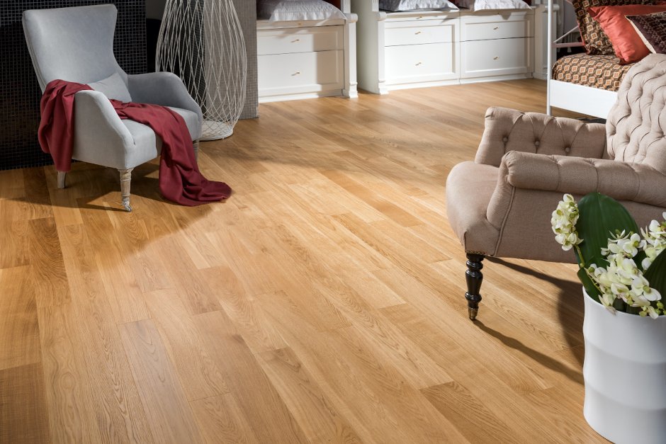 Пол из натурального дуба прекрасно сочетается с разными стилями оформления - от классического до современного. Он может быть украшением как для гостиной или спальни в загородном доме, так и для стильной квартиры в городском интерьере.