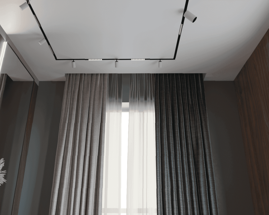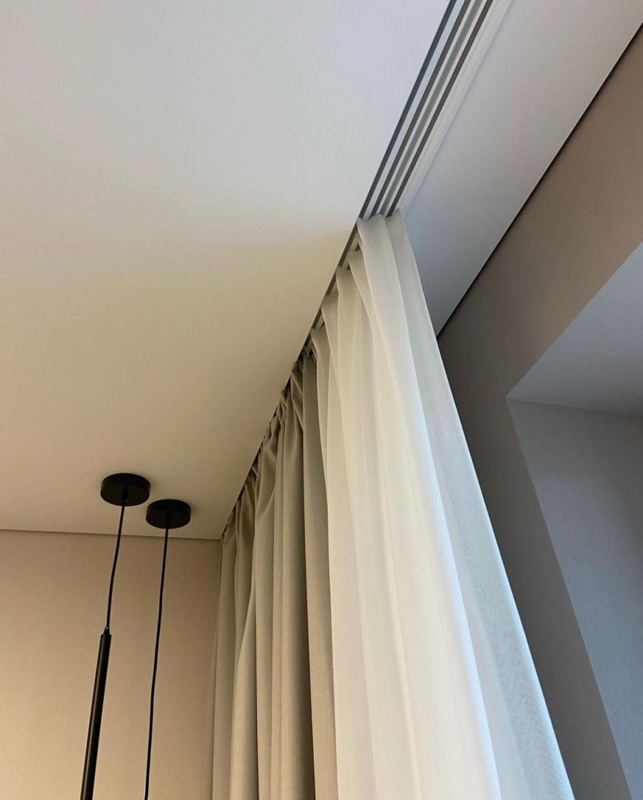 Комбинируя натяжной потолок и гардины для штор, вы получите эффектное сочетание, которое обязательно привлечет внимание. Гардины мягко опускаются на фоне гладкого и ровного потолка, создавая согласованный образ. Они могут быть выбраны в тон потолка или, наоборот, стать ярким акцентом в интерьере.