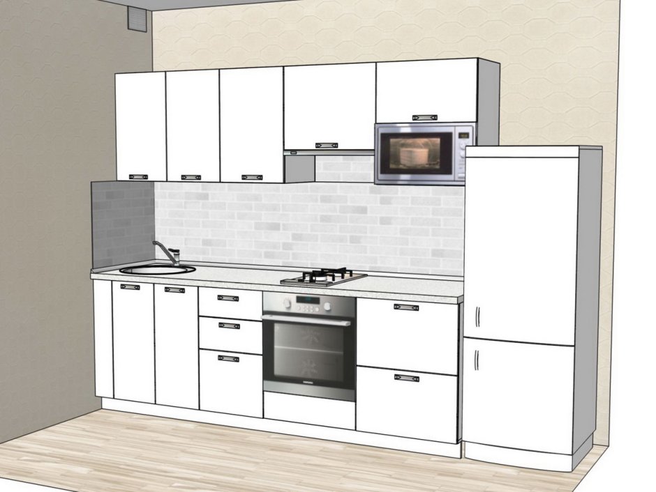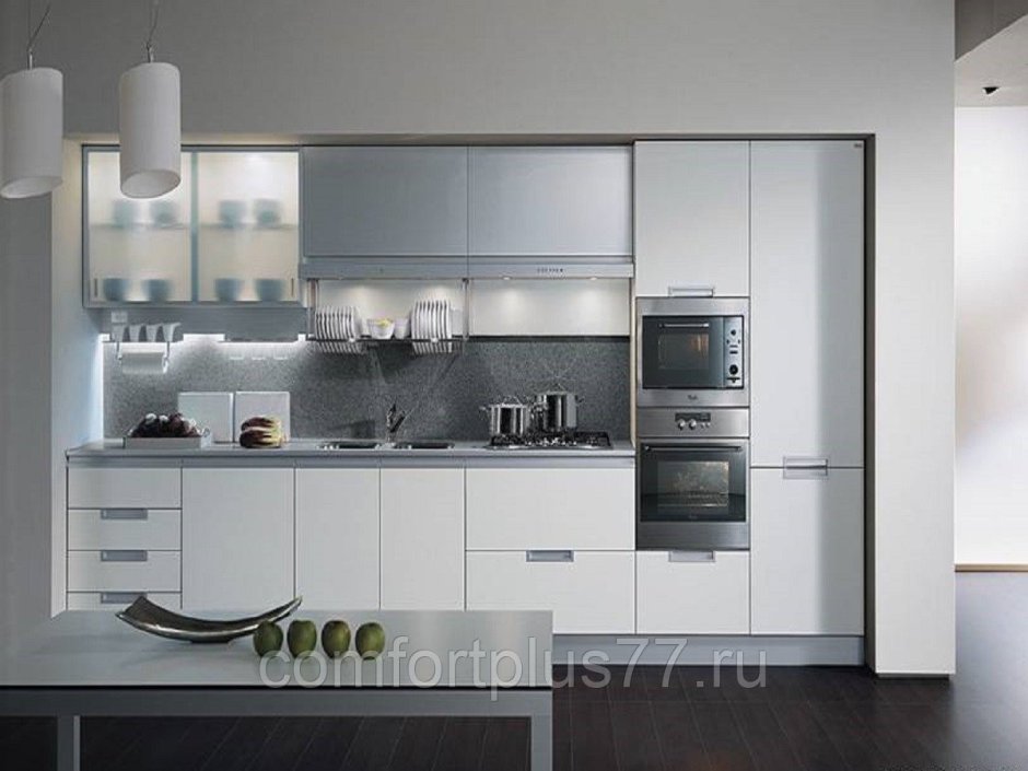 В такой кухне все элементы располагаются последовательно на одной стороне комнаты, образуя гармоничную композицию. Главным преимуществом такой планировки является экономия места, особенно если площадь кухни ограничена.