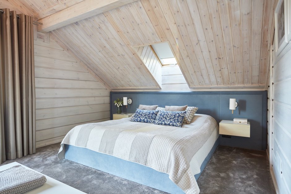 Добро пожаловать в спальню на мансарде в уютном деревянном доме, где комфорт и стиль переплетаются в совершенной гармонии. Это пространство, созданное для отдыха и расслабления, окутывает вас теплотой и приглашает забыть о повседневных заботах.