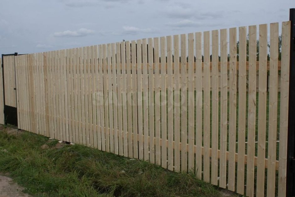 На фотографии представлен забор из деревянного штакетника, который является отличным решением для создания элегантной и уютной атмосферы на вашей территории. Дерево – это естественный материал, который придает вашему участку неповторимый шарм и природную красоту.