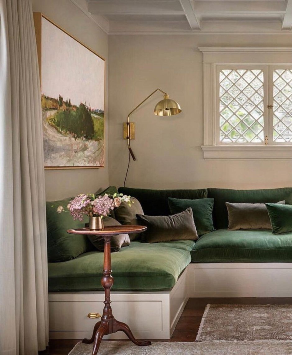 Представьте себе уютную гостиную, в которой главным акцентом является зеленый диван. Этот яркий предмет мебели прекрасно сочетается с бежевым интерьером и добавляет нотку свежести и жизненности.