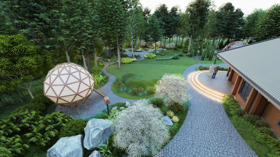 Ландшафтная сфера также предоставляет возможность создать различные зоны и функциональные помещения. Так, например, можно организовать уютный уголок для отдыха с пушистыми подушками и книжной полкой, а рядом сделать прекрасное место для барбекю или пикника с друзьями.