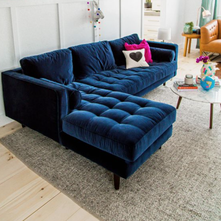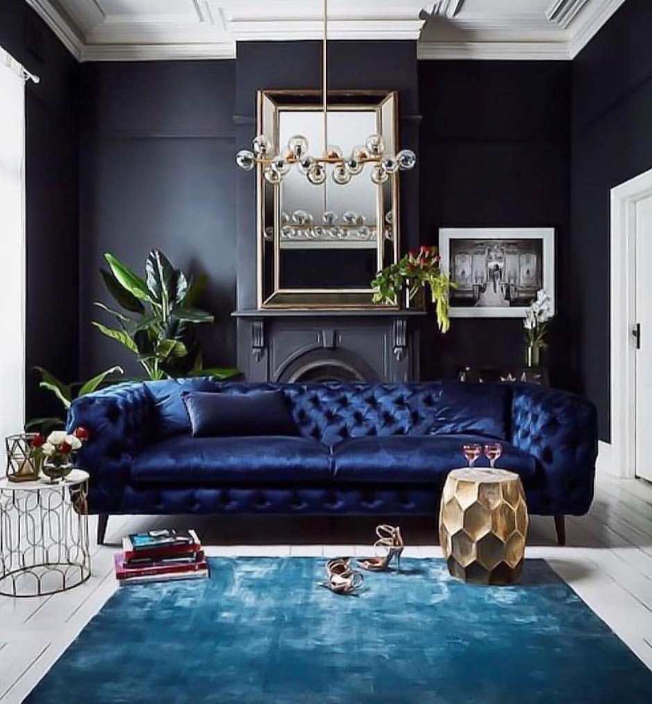 Синий велюровый диван в интерьере