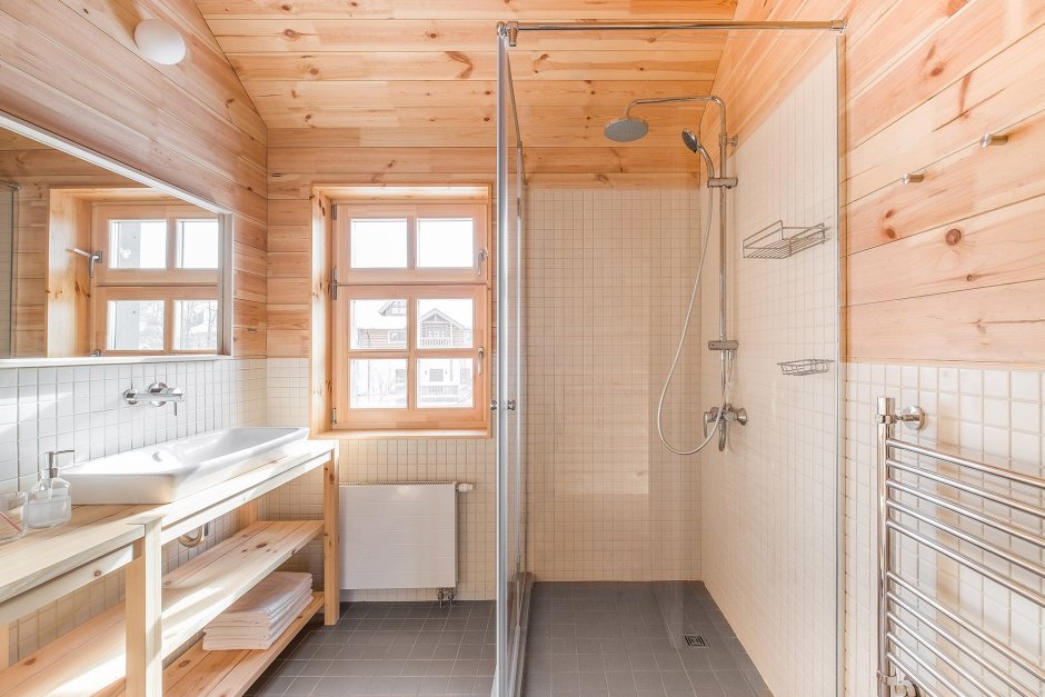 Интерьер душевой комнаты в доме из клееного бруса