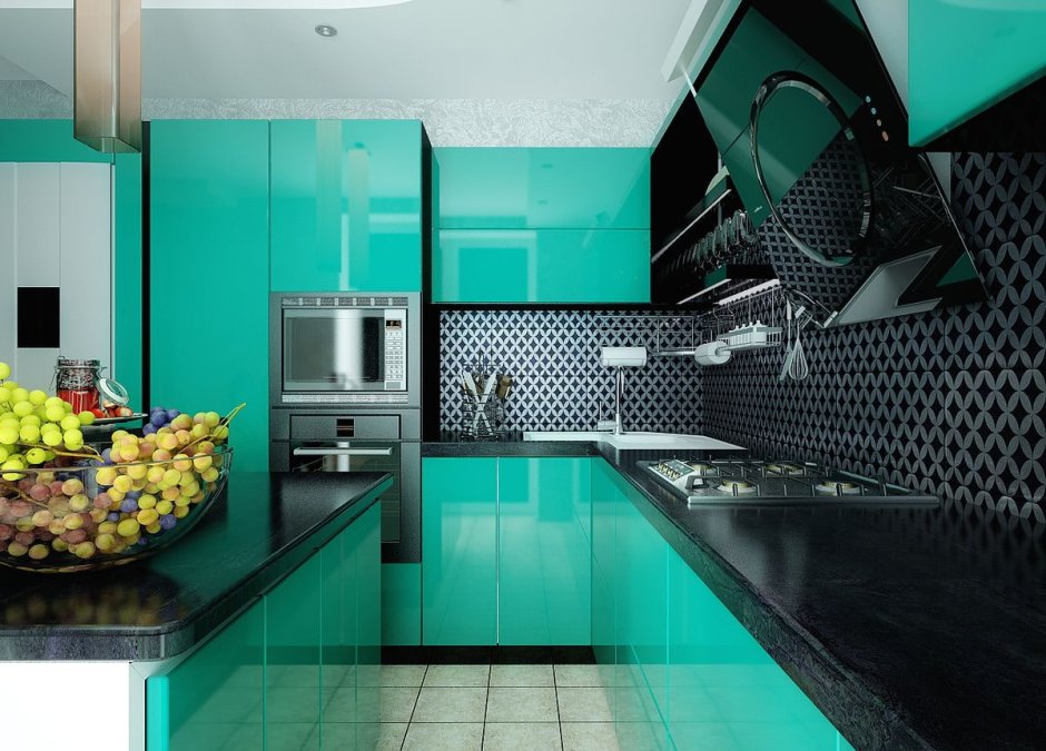 Кухня в черно-бирюзовых тонах привлекает внимание и подчеркивает индивидуальность хозяев. Она станет настоящим украшением любого дома. Черные кухонные шкафы и столешницы выглядят элегантно и сдержанно, а бирюзовые акценты добавят яркости и свежести.