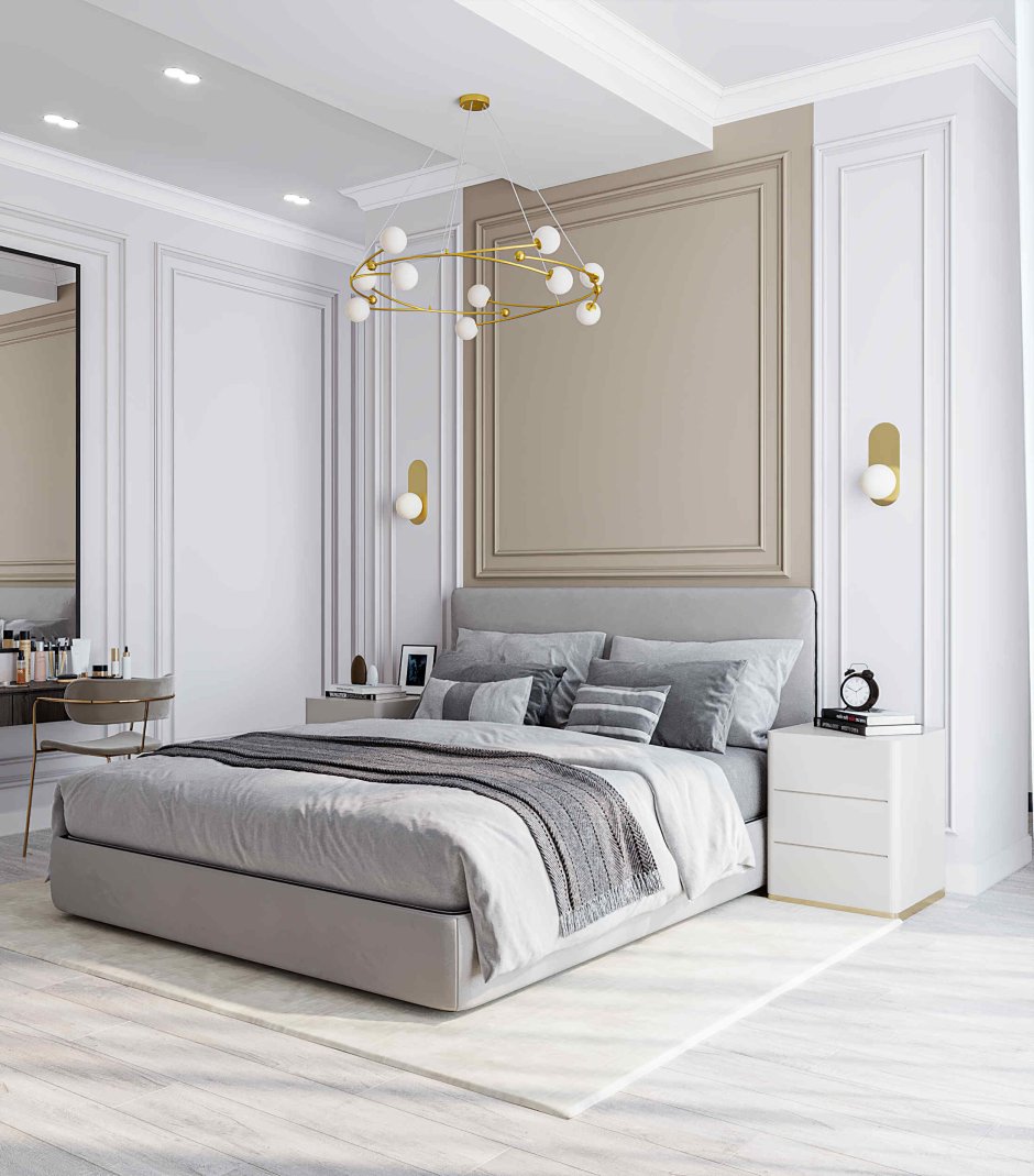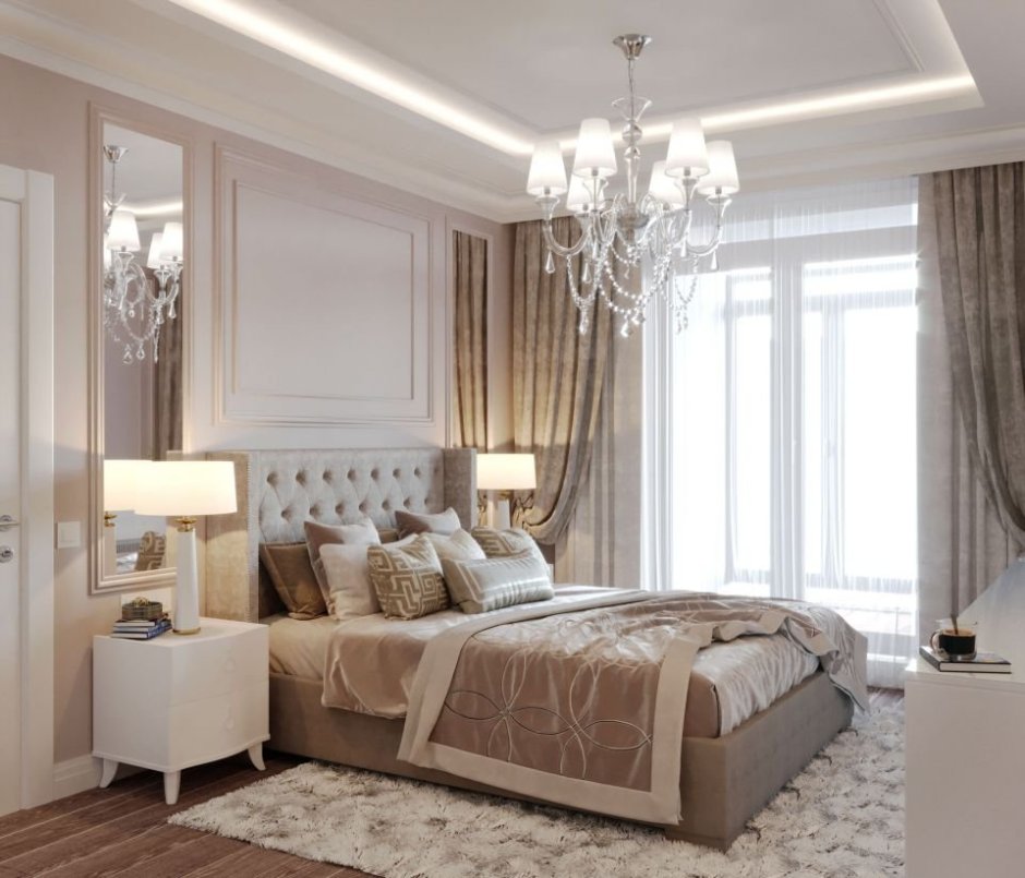 Особое внимание уделяется освещению в спальне в стиле неоклассика. Роскошные люстры с кристаллами или светильники в виде свечей создают эффектное освещение и придают помещению аристократическую атмосферу.